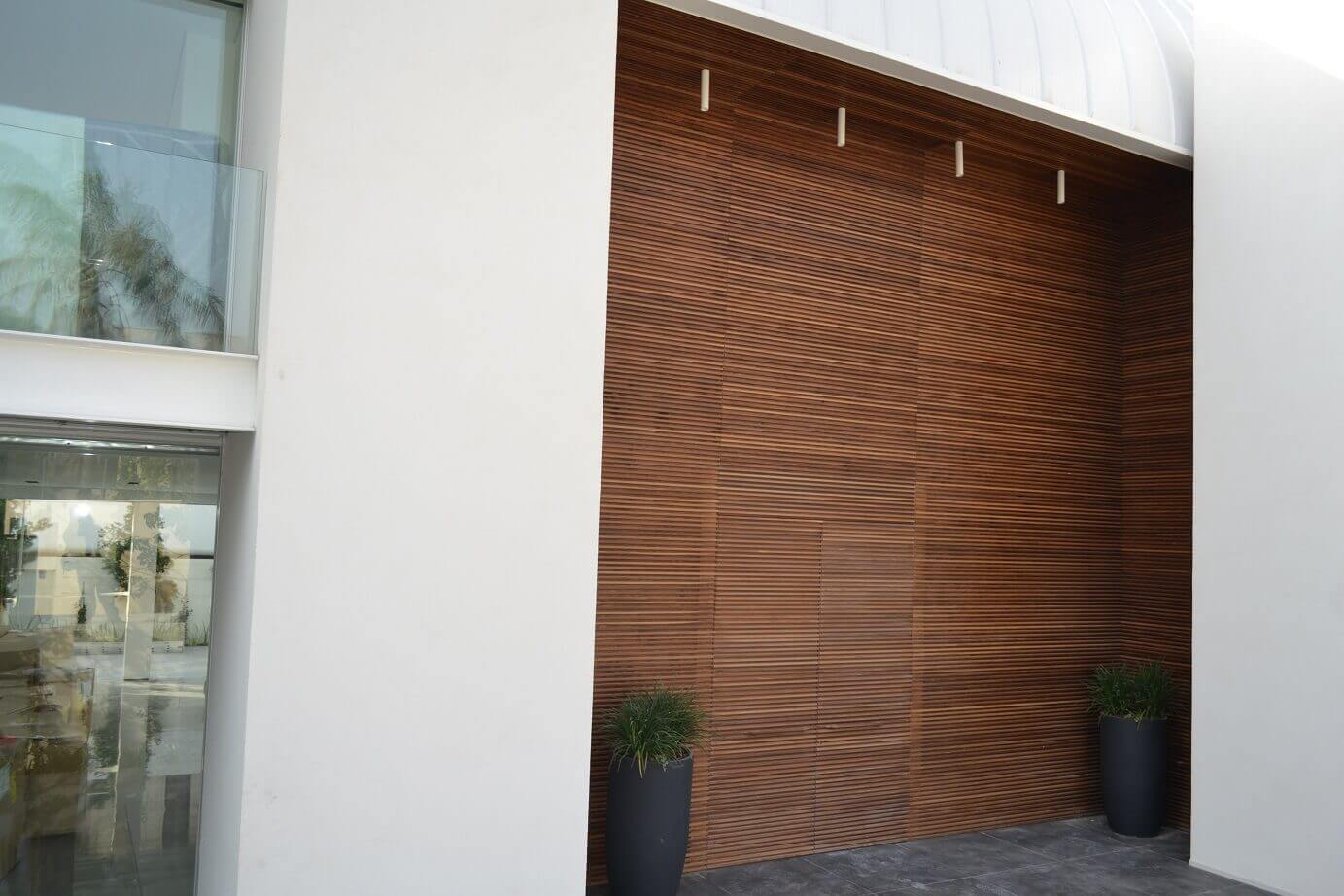 חיפוי עץ איפאה דקורטיבי לחזית בית פרטי.נצבע ב2 שכבות מגן בגוון שקוףניקוי במנקה העץ Bondex Wood Cleaner וצביעה עם Bondex Extra.צבע מגן חצי שקוף על בסיס מים להגנה כנגד קרינת UV, מים, ריקבון ופגעי מזג האוויר.